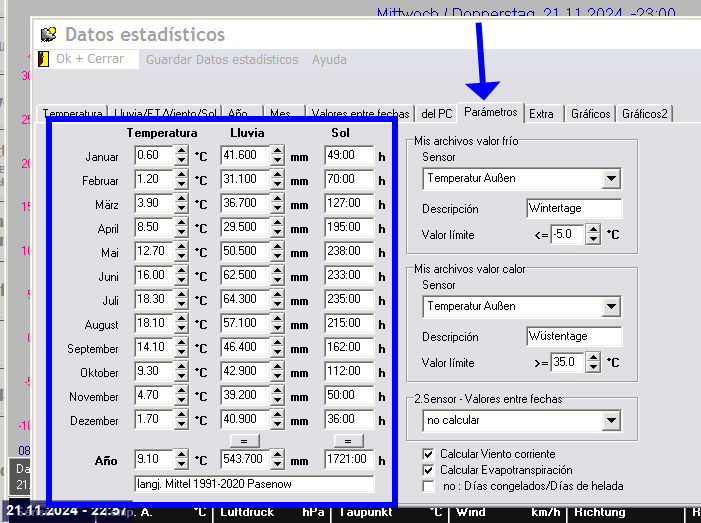18) Unter >Wetter >Statikdaten >Einstellungen >Statistikdaten hinterlegen (Langzeitmittelwerte für Monate und Jahr)