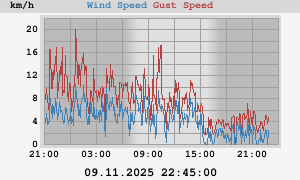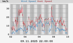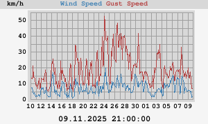max: 23,2 km/h at 07.11.2025 17:25:00 max gust: 34,9 km/h at 03.11.2025 12:45:00